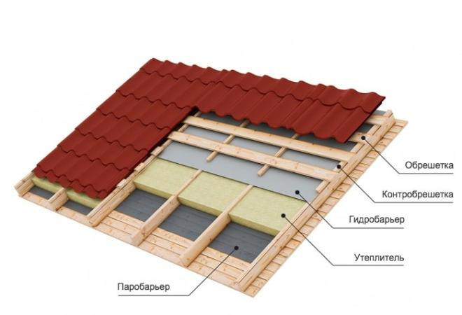 Между металлочерепицей и утеплителем обязательно оставляют вентиляционный зазор (3–5 см).