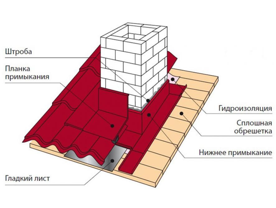 Цегляні труби димоходів слід розташовувати на відстані 15 сантиметрів від дерев’яної решетування, гідро та паробар’єрів. Для того щоб правильно обійти димохідну трубу на покрівлі з профнастилу використовують спеціальні внутрішні та зовнішні фартухи. Нижню планку штробують у саму цегляну стіну димаря на глибину не менше 1 см. Нижня планка має бути висотою 10-15 сантиметрів вище поверхні покрівлі.