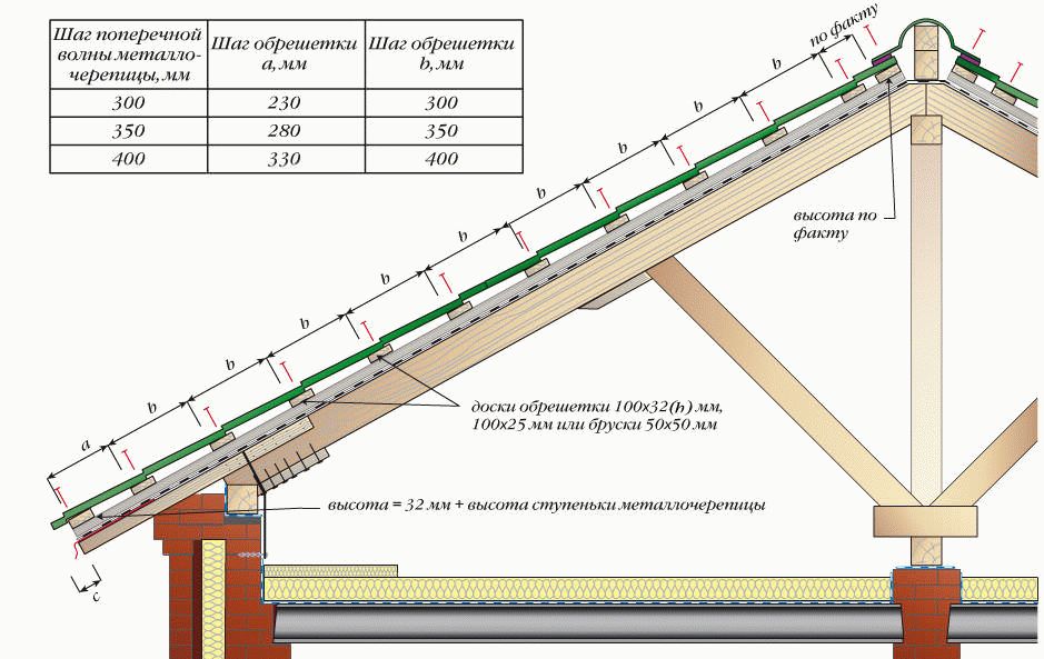 Як видно з малюнка, відстань між дошками має відповідати довжині хвилі черепиці. Монтаж обрешітки завжди починають знизу вгору (від карниза до ковзана). Стартову дошку монтують горизонтально по краю кроквяної системи, фіксується двома шурупами до бруса контробрешітки. На стартову дошку кріплять брус такої ж товщини, що і всі дошки решетування – це виключає можливість провисання металочерепиці. Інтервал першого ряду решетування завжди менший за всі інші ряди, які повинні відповідати довжині тайла самого покрівельного матеріалу.